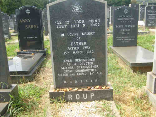 Esther married Simon ROUP. (Simon ROUP was born in 1902, died on 26 May 1977 in Cape Town, South Africa and was buried in Pinelands.) |