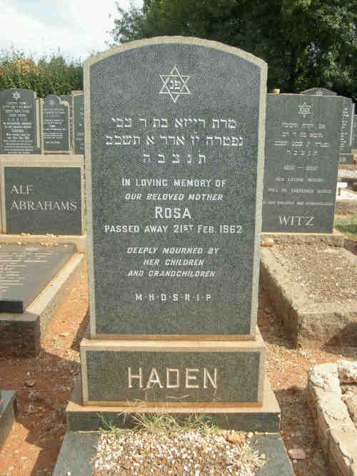 Rosa married Elias HAYDEN, son of Samuel HEYDENREICH and Celine ARENSBERG. (Elias HAYDEN was born in 1875 in Mitau, Kurland, died on 21 Dec 1948 in Johannesburg, South Africa and was buried in JHB West Park.) |