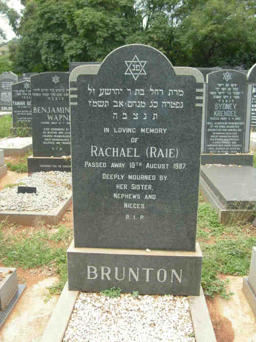 Rachel married Nathan Newton BRUNTON. (Nathan Newton BRUNTON was born in 1888, died on 1 May 1973 in Johannesburg, South Africa and was buried in JHB West Park.) |
