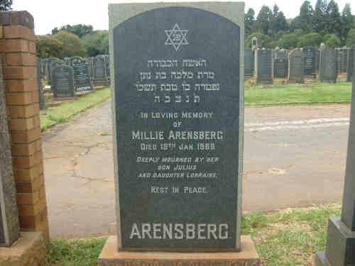 Millicent married Adolf ARENSBERG, son of Benjamin ARENSBERG and Annette LESERSOHN, in England. (Adolf ARENSBERG was born in 1871, died on 31 Oct 1959 in Johannesburg, South Africa and was buried in JHB West Park.) |