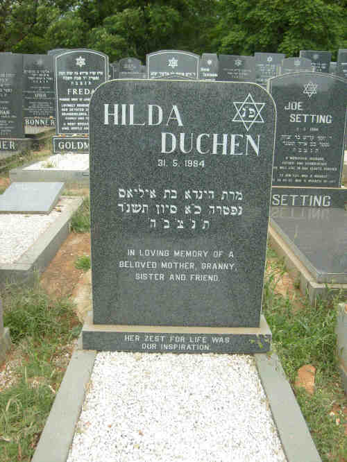 Hilda married Dan Gedalia DUCHEN. (Dan Gedalia DUCHEN was born in 1894, died on 16 Feb 1961 in Johannesburg, South Africa and was buried in JHB West Park.) |